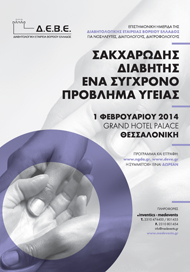 Η Διαβητολογική Εταιρεία Βορείου Ελλάδος διοργανώνει Επιστημονική Ημερίδα για Νοσηλευτές, Διαιτολόγους, Διατροφολόγους και παραϊατρικό προσωπικό με θέμα: “Σακχαρώδης Διαβήτης, ένα σύγχρονο πρόβλημα υγείας” το Σάββατο 1 Φεβρουαρίου 2014 στη Θεσσαλονίκη.