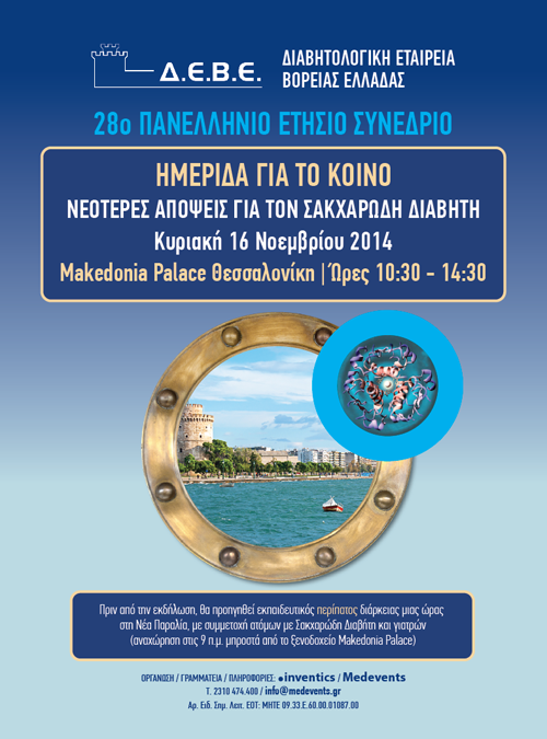 Η Διαβητολογική Εταιρεία Βορείου Ελλάδος, στα πλαίσια του 28ου Πανελλήνιου Ετήσιου Συνεδρίου της, διοργάνωσε Ημερίδα για το κοινό με θέμα «Νεότερες απόψεις για τον Σακχαρώδη Διαβήτη», την Κυριακή 16 Νοεμβρίου 2014, στο ξενοδοχείο Makedonia Palace στη Θεσσαλονίκη.