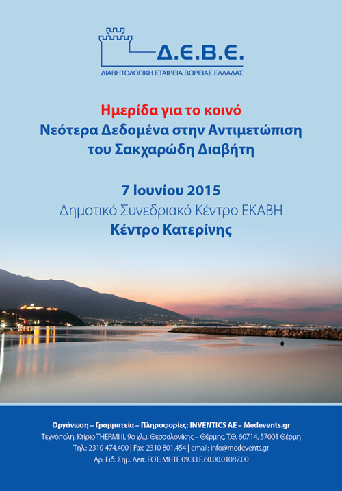 7 Ιουνίου 2015, Κατερίνη, Ημερίδα για το κοινό με θέμα: “Νεότερα δεδομένα στην αντιμετώπιση του Σακχαρώδη Διαβήτη στο Δημοτικό Συνεδριακό Κέντρο ΕΚΑΒΗ