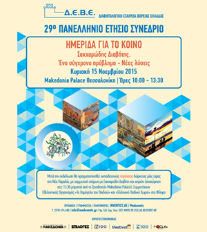Η Διαβητολογική Εταιρεία Βορείου Ελλάδος διοργανώνει, στο πλαίσιο του 29ου Ετήσιου Πανελλήνιου Συνεδρίου της, Ημερίδα για άτομα με Σακχαρώδη Διαβήτη με θεμα: Σακχαρώδης Διαβήτης. Ένα σύγχρονο πρόβλημα – Νέες λύσεις την Κυριακή 15/11/2015 και ώρες 10:00 – 13:30 στο ξενοδοχείο Makedonia Palace Θεσσαλονίκη.