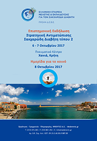 Η Ελληνική Εταιρεία Μελέτης και Εκπαίδευσης για τον Σακχαρώδη Διαβήτη (πρώην Δ.Ε.Β.Ε.) διοργανώνει στις 6-7 Οκτωβρίου 2017 στα Χανιά, Επιστημονική Εκδήλωση με θέμα “Στρατηγική Αντιμετώπισης Σακχαρώδη Διαβήτη Τύπου 2”.
