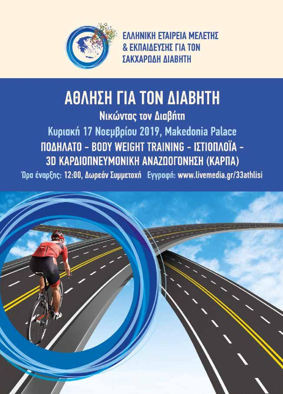 Η Ελληνική Εταιρεία Μελέτης και Εκπαίδευσης για τον Σακχαρώδη Διαβήτη διοργανώνει, στο πλαίσιο του 33ου Πανελλήνιου Ετήσιου Συνεδρίου της, Διαδραστική Ημερίδα για το κοινό με θέμα: «Νικώντας τον Σακχαρώδη Διαβήτη» και θα αφορά στην αποτελεσματική διαχείριση του Σακχαρώδη Διαβήτη στην καθημερινότητα. Η Ημερίδα θα πραγματοποιηθεί την Κυριακή 17 Νοεμβρίου 2019 και ώρα 10:30 π.μ. – 12.00 μ.μ. στο ξενοδοχείο Makedonia Palace στη Θεσσαλονίκη.