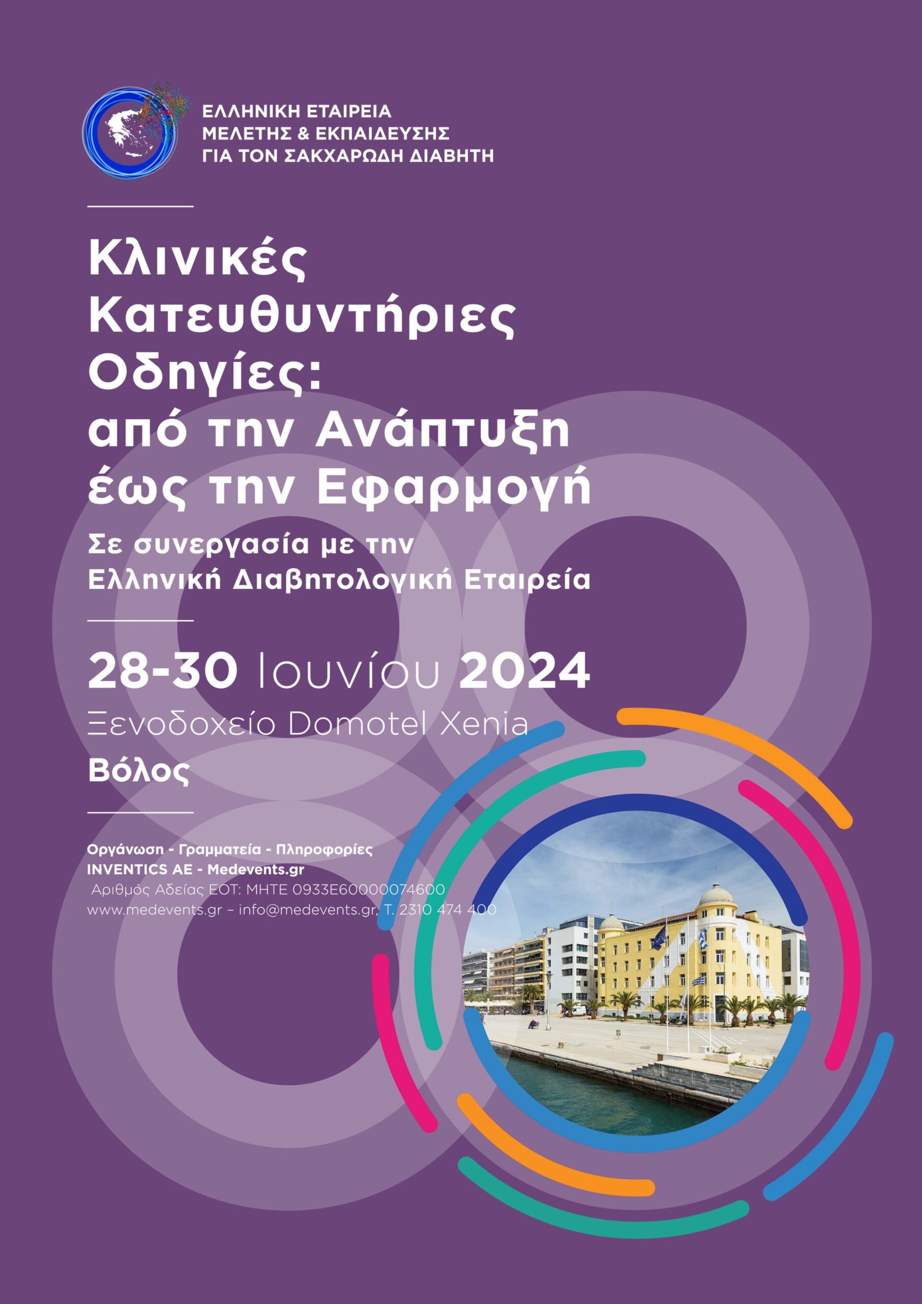 Η Ελληνική Εταιρεία Μελέτης και Εκπαίδευσης για τον Σακχαρώδη διαβήτη διοργάνωσε συνέδριο με τίτλο «Κλινικές Κατευθυντήριες Οδηγίες: από την Ανάπτυξη στην Εφαρμογή» από τις 28 έως τις 30 Ιουνίου 2024 στο ξενοδοχείο Domotel Xenia, Βόλος, σε συνεργασία με την Ελληνική Διαβητολογική Εταιρεία.