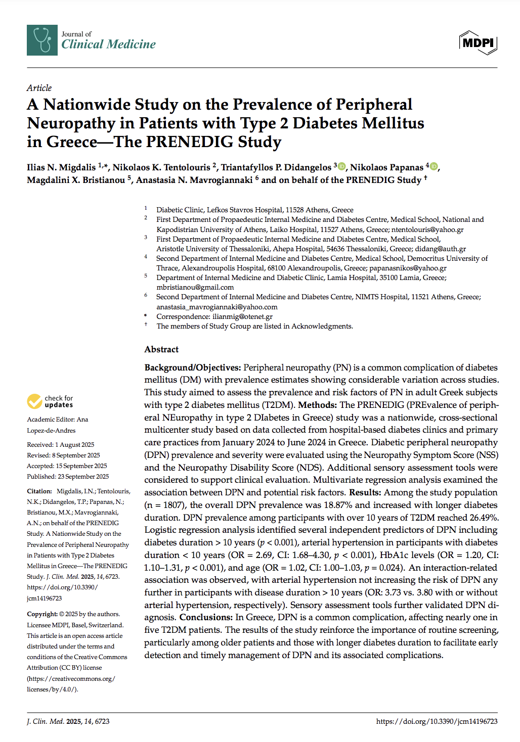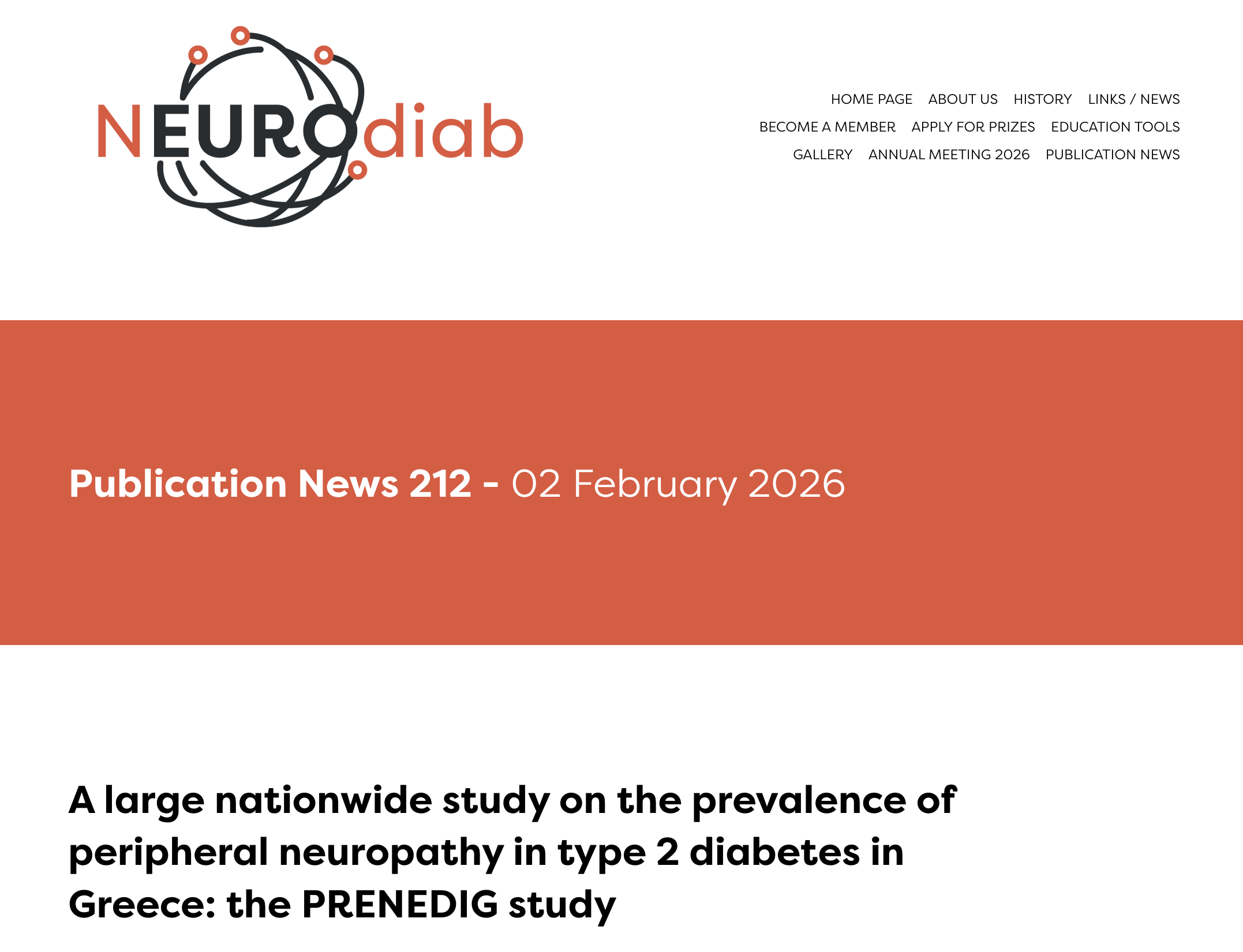 Η μελέτη με τίτλο “A large nationwide study on the prevalence of peripheral neuropathy in type 2 diabetes in Greece: the PRENEDIG study” επιλέχθηκε από την Εταιρεία Μελέτης της Διαβητικής Νευροπάθειας (NEUROdiab) για δημοσίευση στο Newsletter του Φεβρουαρίου 2026..