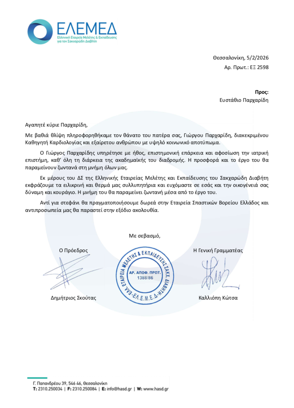 Η ΕΛΕΜΕΔ εκφράζει τη βαθιά της θλίψη για το χαμό του διακεκριμένου Καθηγητή Καρδιολογίας και εξαίρετου ανθρώπου, με υψηλό κοινωνικό αποτύπωμα, Γιώργου Παρχαρίδη με την παρακάτω συλλυπητήρια επιστολή που απέστειλε στην οικογένεια του και τον γιό του κ. Ευστάθιο Παρχαρίδη: